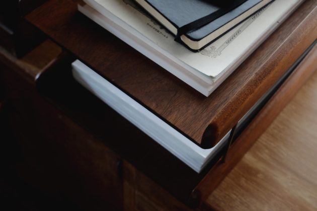 小傷や多少のサビはありますが、油っぽさやひどい汚れはなく、日常的に使えるコンディション。アーミーグリーンの使い込まれた表情は、濃いめの色味の木のデスクとは相性抜群です。