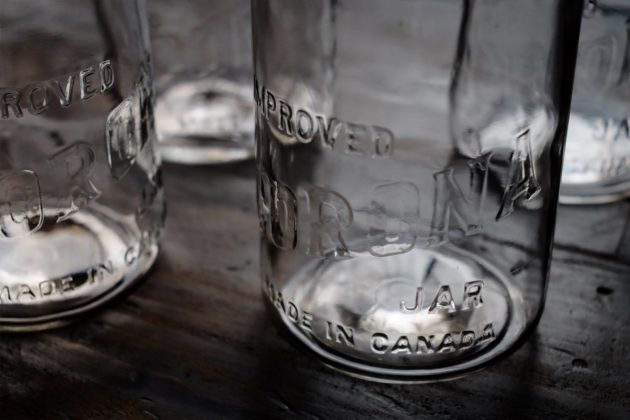 カナダからやってきた、ちょっとマイナーなヴィンテージのメイソンジャー。円筒状のボディにガラスの蓋+金属リングという組み合わせの一品です。