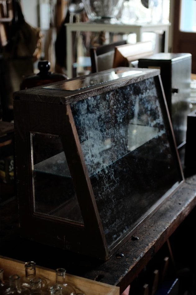 こちらは計測記録装置が収められていた縦置き型の木箱です。記録装置自体は損なわれていますが、この箱、なかなかかっこいいです。内部に棚板を取り付けて小物の収納というのもいいですし、フックを取り付けて鍵やアクセサリーの収納ボックスにするのもありかなと。