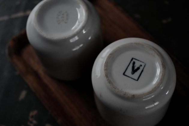 一つ目はHomer Laughlin(ホーマー・ラフリン)。写真中央にある貫入だらけのカップです。Homer Laughlinは現存するブランドのため流通量が多く、ヴィンテージの食器の中ではかなり知名度は高いんではないかなと思いますが、こちらは初期の希少な一品になります。