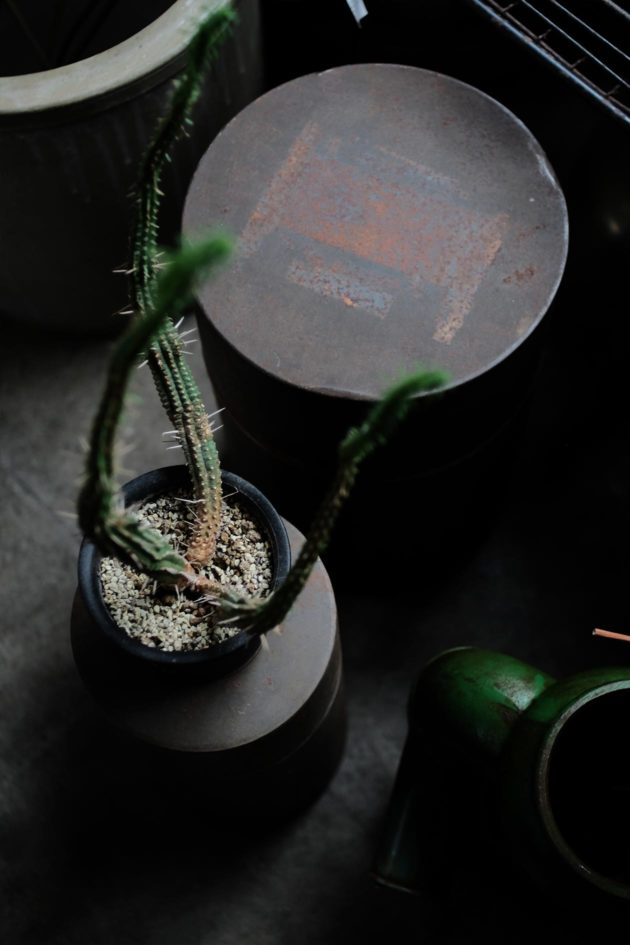 黒いバケツは両サイドに持ち手が付いていて、用途はわからないものの、無骨な表情がとても魅力的です。底には二本のバーが渡してあるだけなので、重たいものや細かいものは入れられませんが、植木鉢のカバーにしたり、袋を入れればクズカゴとしても使えるかと思います。