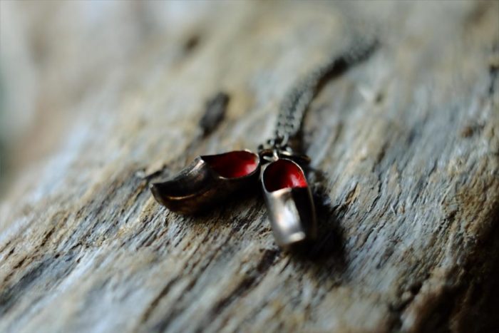 シルバーでできた靴の内側をエナメルで赤く塗られた、1960年代の愛らしいシルバーネックレスです。長さは51cmと、少し長め。ヴィンテージのシルバーらしく、表面には黒... -