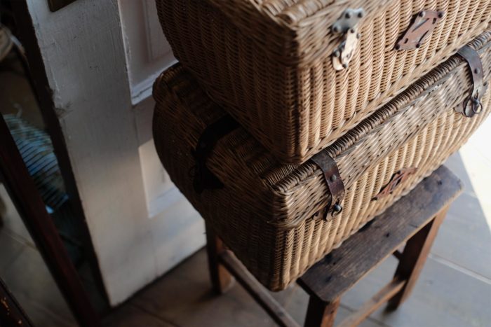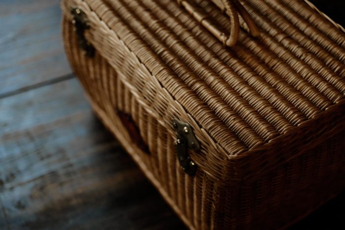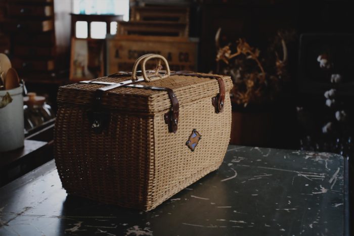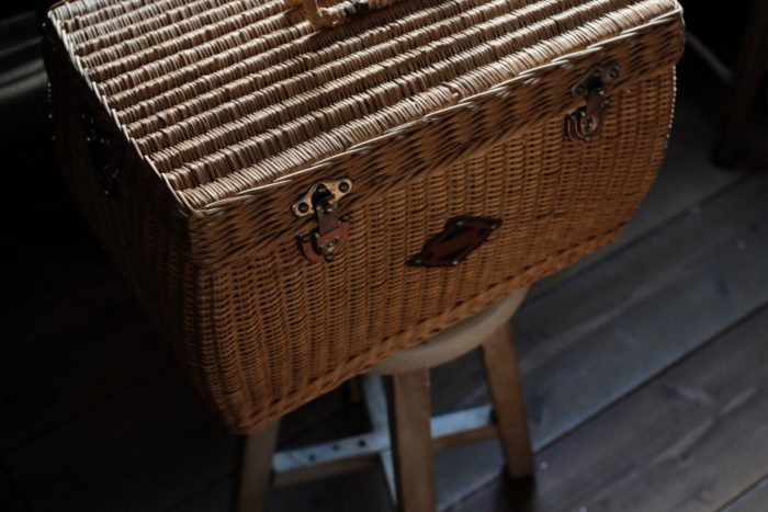状態の良い籐のバスケットが久々に入荷しました。大正~昭和初期の一品です。 入荷時、ありがちなカビ臭や目立った汚れはなく、留め具の錆びも見られませんでした。籐は... -