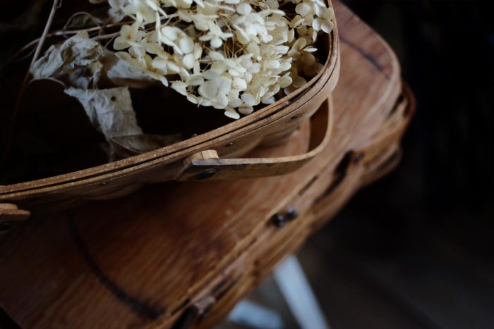 飴色になった日本の古いバスケット。大正~昭和のはじめ頃に作られていた一品です。 蓋と側面はふっくらとふくらんでいて、上品でやさしい感じのフォルム。編みはがっし... -