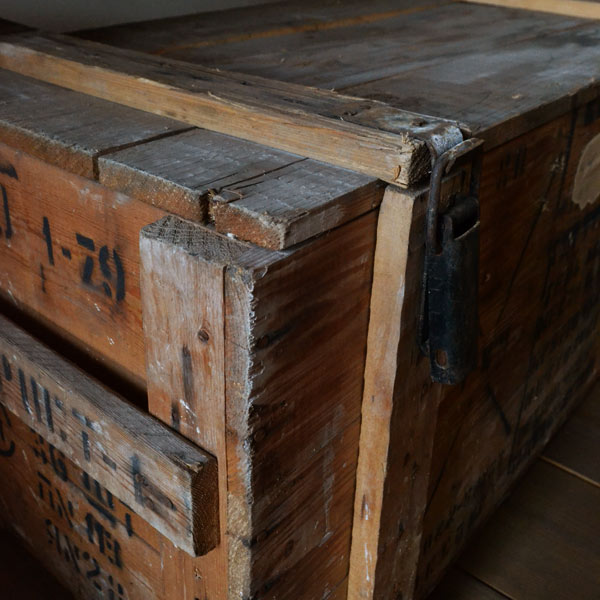 大きな木箱が入荷しました。1950~70年代にロシアでガスマスクの保管用に使用されていた一品です。欠けや凹みなどは多少ありますが、屋内で保管されていたため木の腐食...