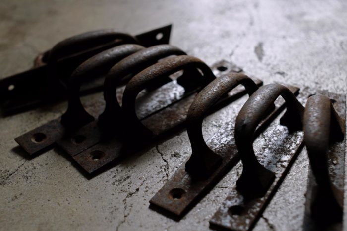 古い家具に使われていた錆び錆びのアイアンの取っ手。持ち手部分は片側に傾けて取り付けられていますが、とにかくシンプルなので、使うところを選びません。引き出しに... -