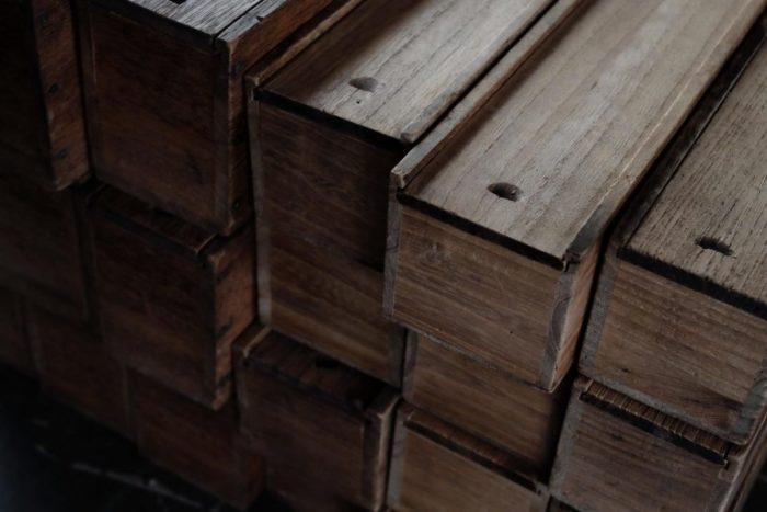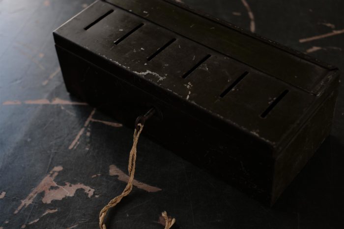 日本の工場で使われていた蓋付きの古い木箱。蓋はどれもスライド式ですが、大きさと材質違いで、オンラインストアには3タイプ掲載しました。 実際に入れられていたもの... -