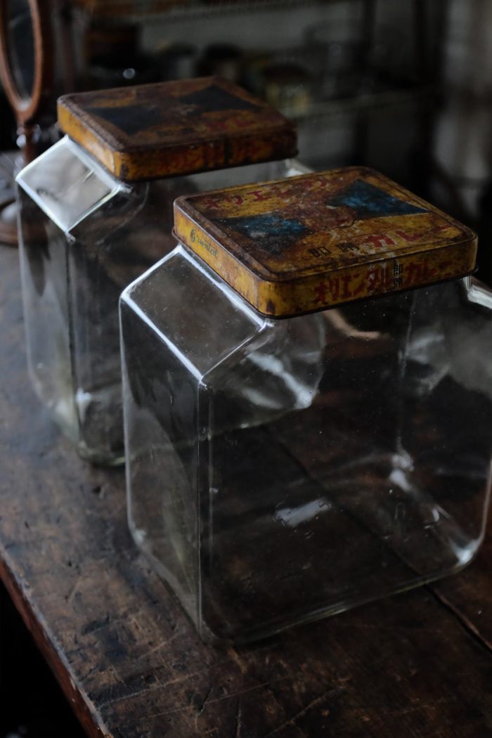 日本の古いガラス容器を5点アップしました。 四角い瓶は、味付け海苔が入っていた瓶になります。ガラスはクリアが2点とブルーが1点。蓋はクリアの方がアルミ製、ブルー... -
