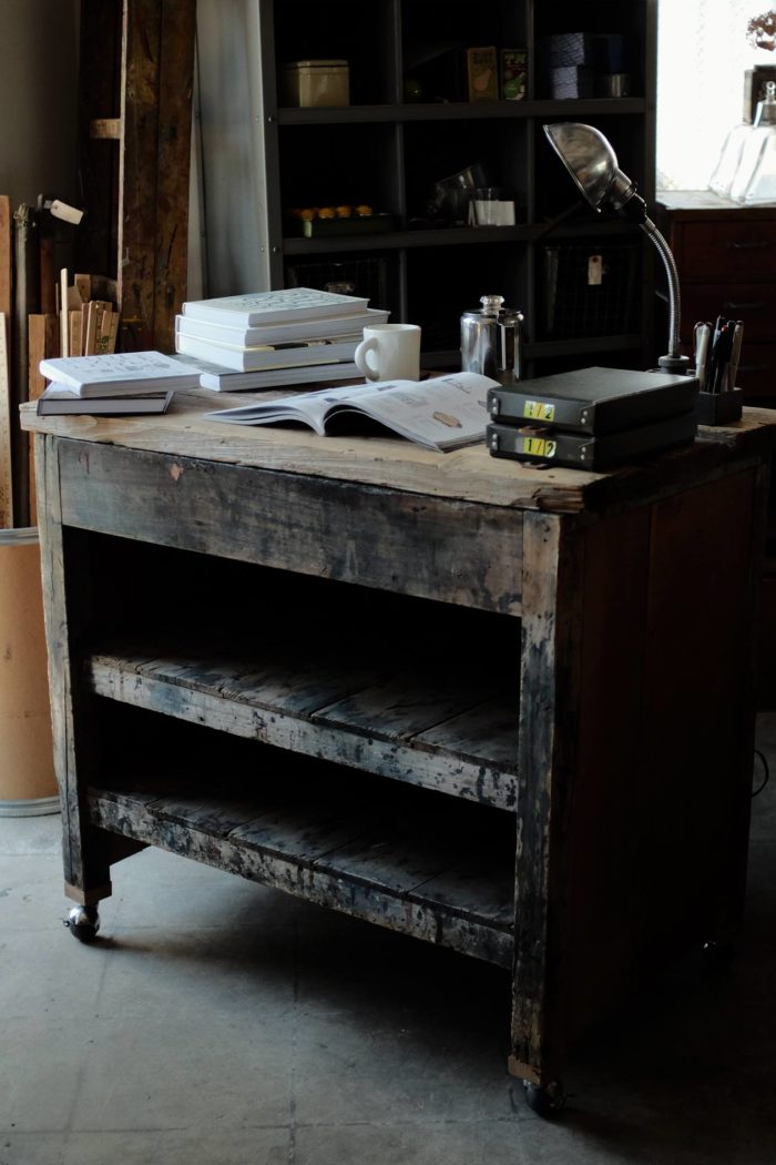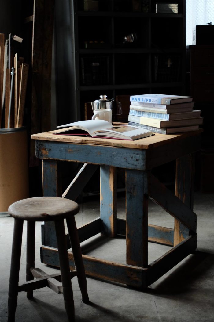 今日はもう一つ、アメリカの工場で軽作業用に使われていたローテーブルをアップしています。 天板はおよそ60cm四方の正方形に近い形で、高さは64cm程度。お酒を飲んだり...