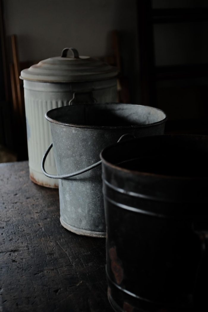 引き続き丸い入れ物をアップしました。バケツが2つととゴミ箱が1つ。どれもデザイン的にはなんてことないかもしれませんが、経年変化や風合いは非常に魅力的です。 黒い...