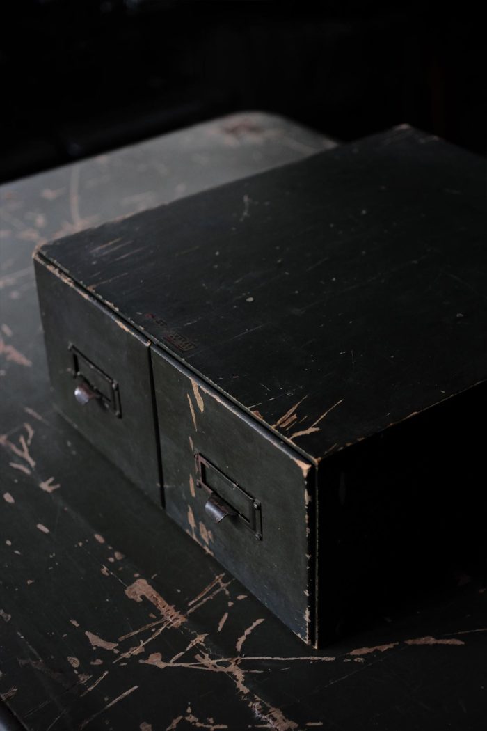 アメリカより、程よくくたびれた2点。 黒い方は、おそらくレコードケースと思われるスチール製のボックス。フロントに書かれた文字の上からは紙が貼られ、トップには絆... -