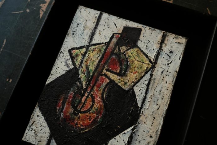 小ぶりなキャンバスに、おそらくアクリルで描かれたと思われるチェロ奏者。専門ではありませんが、トーンが気に入って仕入れた一品になります。 木枠は裏面以外黒に塗ら...