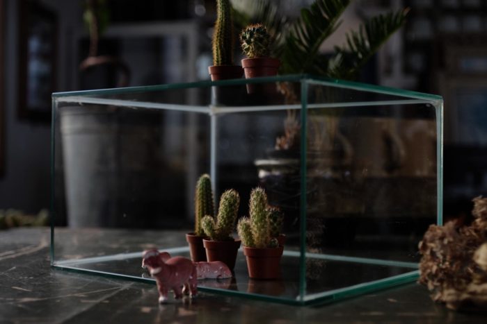 おそらく水槽として使われていたものと思われる四角いガラスの容器。今のところ水漏れはありませんが、角には欠けやヒビも見受けられるので、ドライやコレクションのデ... -