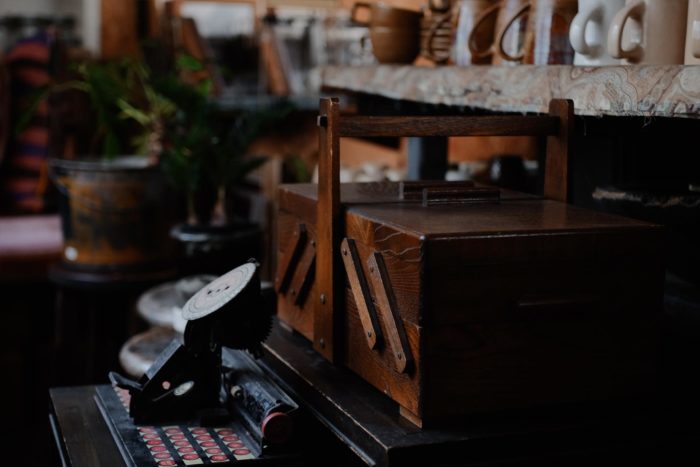 収納力抜群な二段式のソーイングボックス(裁縫箱)。ちょっとだけ古い日本の一品です。上段はそれぞれ斜め外側に展開し、下段が現れる構造。容量があって、なおかつ収... -