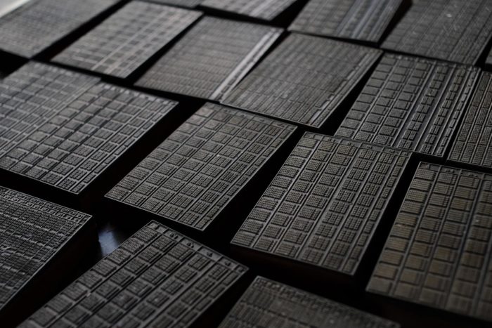 細かい数字がびっしりと並んだ活字版。「工業計算 六桁対数 数値表」という文字の入った活字版が一緒に収まっていたので、その数値表なのだということは理解できますが... -