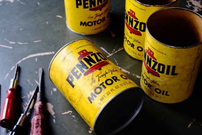 鮮やかなカラーが目をひくモーターオイルの缶です。整備工場で使われていたため、シミ汚れやサビが見られますが、そんなくたびれた雰囲気がむしろ好ましい感じ。文字の... -