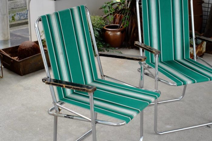 アメリカから届いたレトロなボーダーカラーのフォールディングチェアです。 肘掛けの塗装の剥がれやシート地のほつれ、パイプ部分の若干のサビは見られますが、どれも軽... -