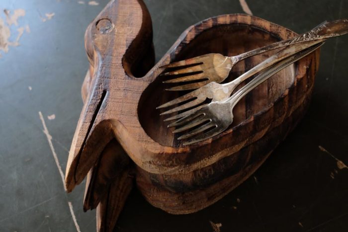 古びた木目がなんともいい表情をした、ヴィンテージの木のトレイです。木目の良さもさることながら、ペリカンというモチーフがまたいいです。小さなグリーンをディスプ... -
