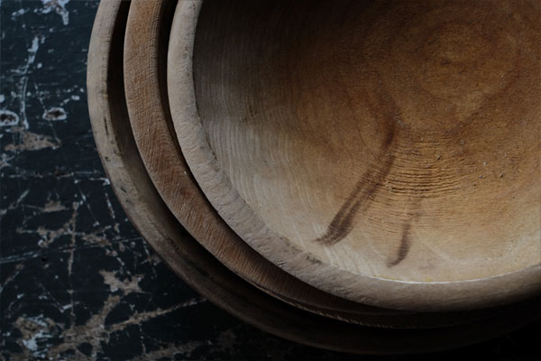 かつてパン生地作りや料理の下ごしらえなどに使われていた木製の古いボウルをアップしました。木のボウルは使い込むほどアメ色にかわってゆくので、そんな経年変化も楽... -