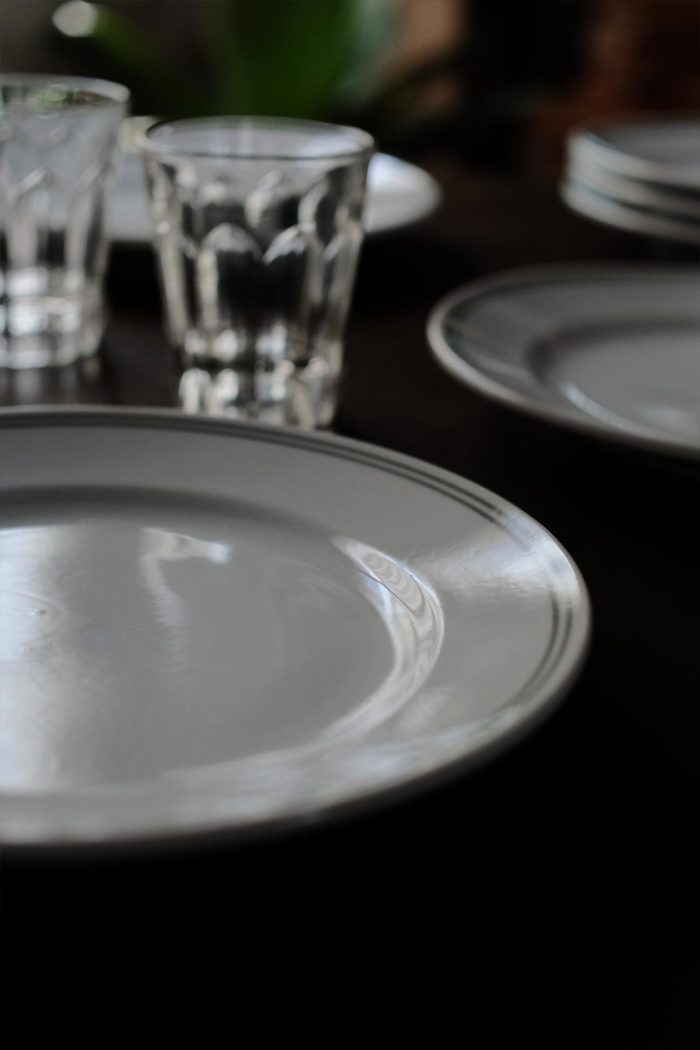 キレイなコンディションの統制陶器の皿と丼鉢が入荷しました。白地にグリーンラインというデザインは、アメリカの古い食器にもよく見られますが、ベーシックで強いクセ... -