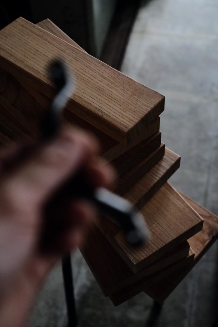 ケヤキの端材とスチール製の取っ手