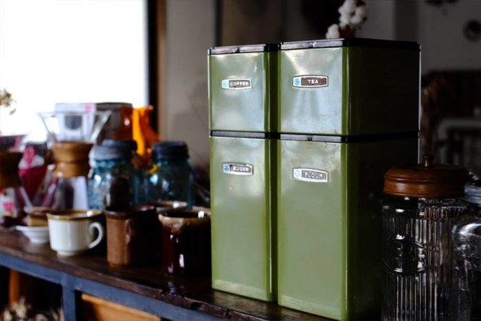 レトロでやさしい雰囲気のアボカドグリーンのキッチンキャニスターセット。色ムラが見られるのは、前オーナーがこまめに磨いていた証。内部には多少のサビは見られるも... -