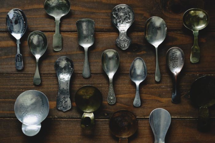 イギリスのスターリングシルバー製スプーン。ホールマークが入っているため、生産年やメーカーなどがほぼ把握されていて、小さいソルトスプーンは1929年製、真ん中のマ... -