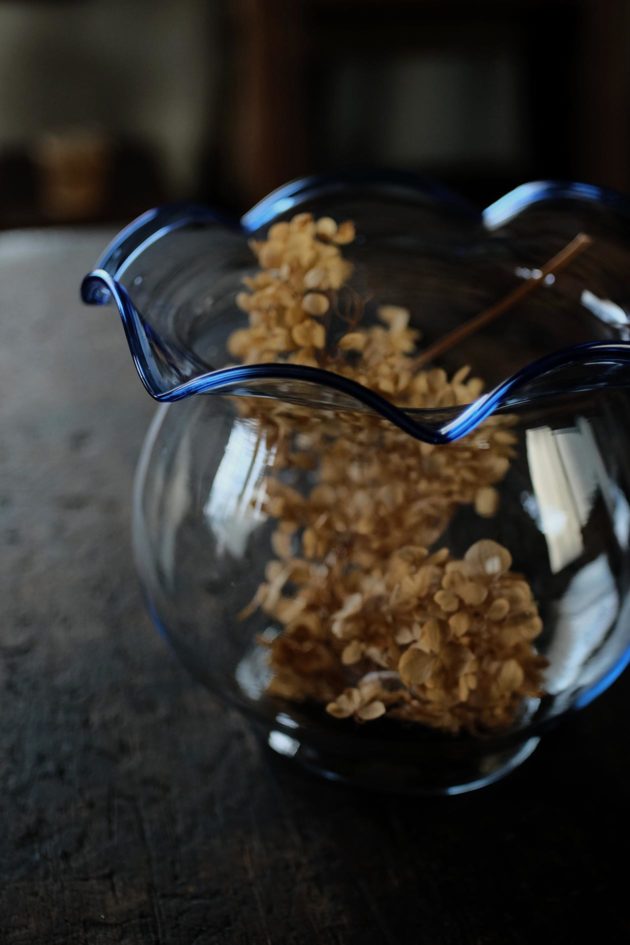 近所で摘んできた草花を生けてもいいですし、水差しにも使えますし、味のあるガラスなのでそのまま飾ってもよしです。