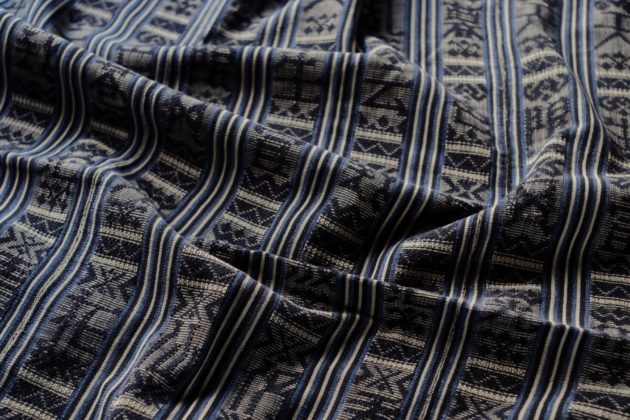 筒状に縫われた四角いこの布は、中国の海南島に暮らす黎族(リー族)の女性が、かつてスカートとして着用していたもの。藍染めされた綿布には織り模様が入り、さらに鮮やかな絹糸で刺繍が加えられていますが、過度な装飾はなく、おおらかな印象を受けます。なお藍は濃い色を保ちつつも少しだけ褪色しており、やや緑に寄った感じのとても味のある色味となっています。