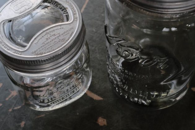 青い蓋の方は、おそらく食品の販売に使われていた瓶。蓋には「to make a delicious tartar sauce」なんて書いてあるので、マヨネーズが入っていたのかもしれません。側面が無地なので、おそらくラベルが貼ってあったのでしょう。ほんとなんてことない、へたしたら使い捨てされてしまうような瓶かと思うんですが、こういう瓶も再利用できるようにちゃんと口径をメイソンジャーのレギュラーマウスサイズにしているところが素晴らしいと思う。無地で主張がないぶん、どこに置いてもすぐに馴染んでくれます。こういうなんてことない瓶ばかりを集めてみるのも面白いかもしれない。